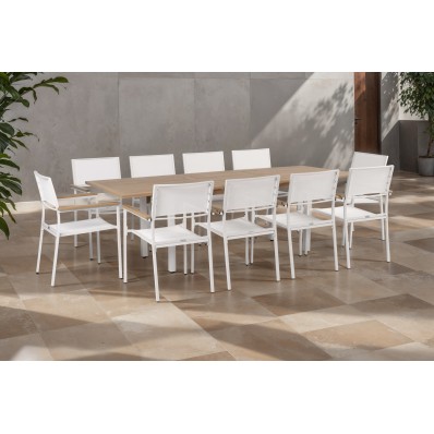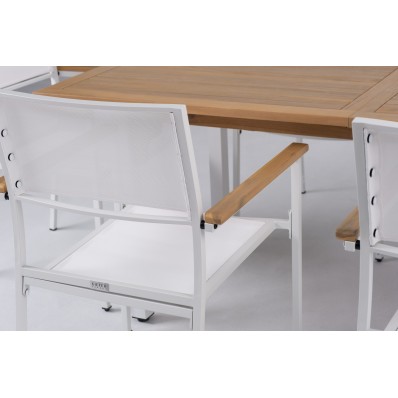 Las sillas tienen una estructura de acero blanco con refuerzo en los reposabrazos en madera de acacia. El asiento y el respaldo están hechos de textileno blanco de gran resistencia. Tanto los refuerzos de madera como el textileno tienen la posibilidad de cambiarse y aumentar la vida útil de las sillas.