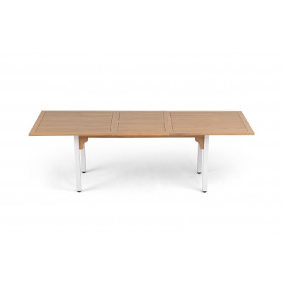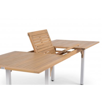 La mesa extensible está fabricada en acero blanco y madera, con refuerzo en las esquinas de las patas para darle estabilidad y resistencia. La longitud de la mesa es de 180cm, llegando a 240cm si se extiende.