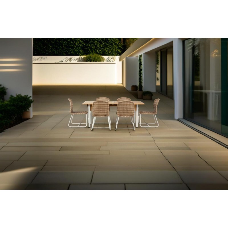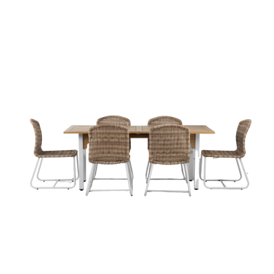 El modelo Sevilla 6 es un moderno comedor de exterior perfecto para tu balcón, jardín o terraza, compuesto por 6 sillas individuales y 1 mesa alta extensible de comedor, por lo que está diseñado para alojar a 6 personas.