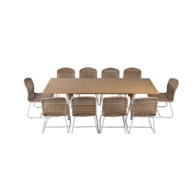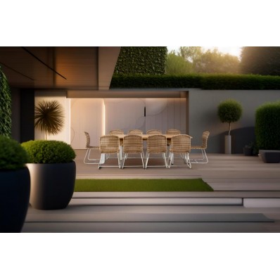 El modelo Sevilla 10 es un moderno comedor de exterior perfecto para tu balcón, jardín o terraza, compuesto por 8 sillas individuales y 1 mesa alta extensible de comedor, por lo que está diseñado para alojar a 10 personas.
