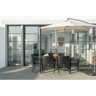 La estructura del mueble de exterior Formentera es de acero inoxidable reforzado recubierto con polietileno de alta densidad trenzado a mano, también conocido como ratán sintético o poliratán, de alta calidad resistente a la intemperie y a los rayos UV.
