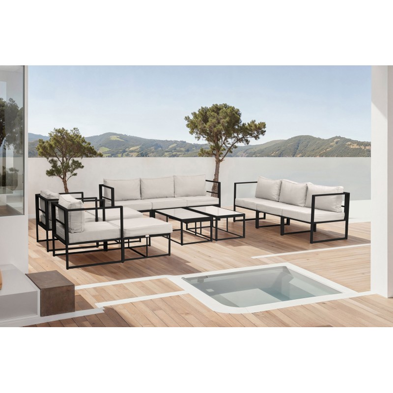 El modelo Lyon Deluxe es un precioso set de muebles de exterior de calidad premium ideal para pasar momentos al aire libre en buena compañía. Se trata de un moderno conjunto de muebles de exterior perfecto para tu balcón, jardín o terraza, compuesto por 2 sofás modulares formados por 4 módulos esquina y 2 módulos centrales, 2 sillones individuales, 2 pufs y 2 mesas bajas de centro, por lo que está diseñado para alojar a 10 personas.