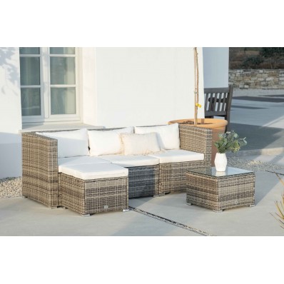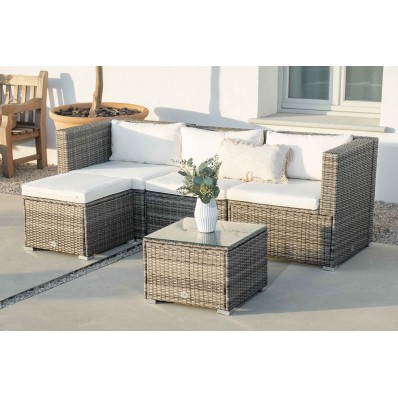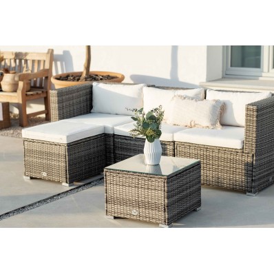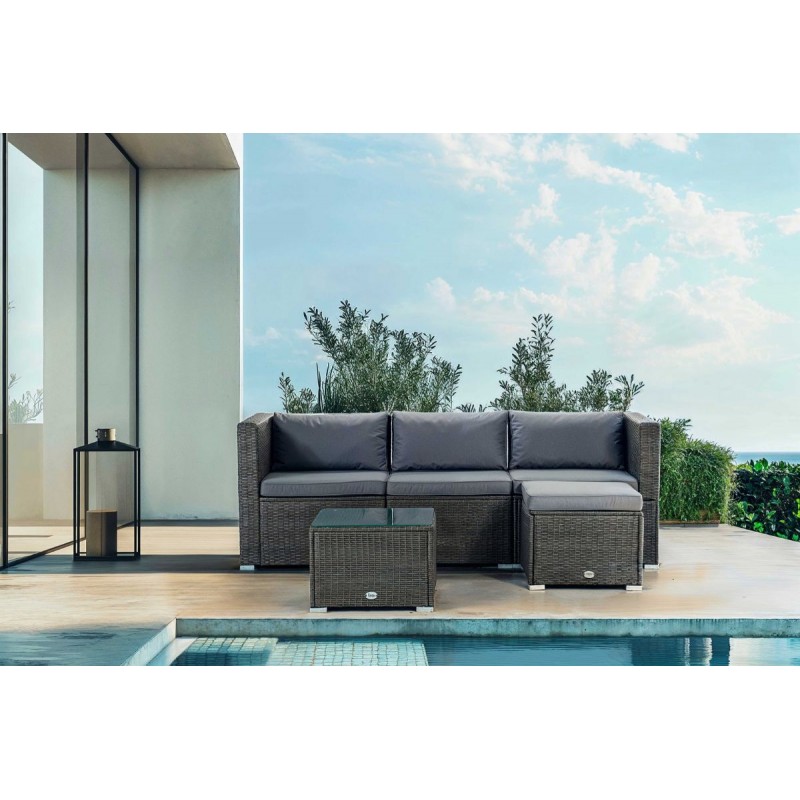 El modelo Bahamas Conjunto Triple es un moderno conjunto modular de muebles de exterior perfecto para tu balcón, jardín o terraza, compuesto por 1 sofá triple, un puf y 1 mesa de centro, por lo que está diseñado para alojar a 4 personas.