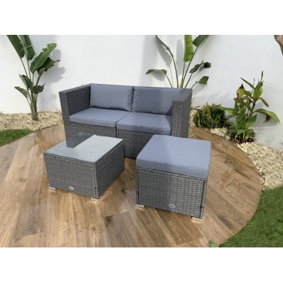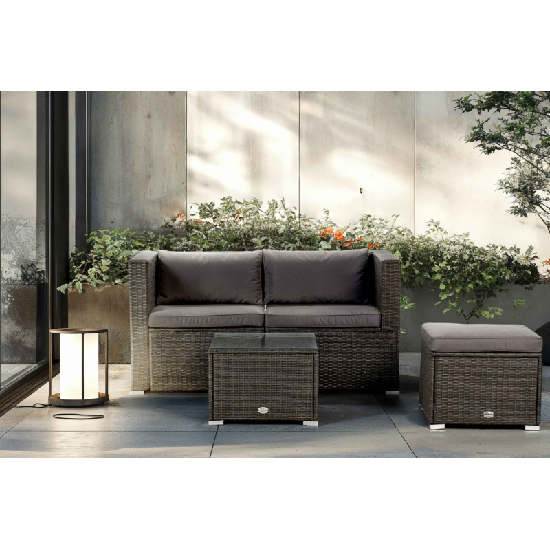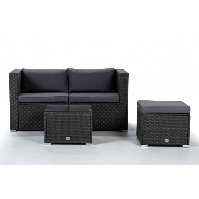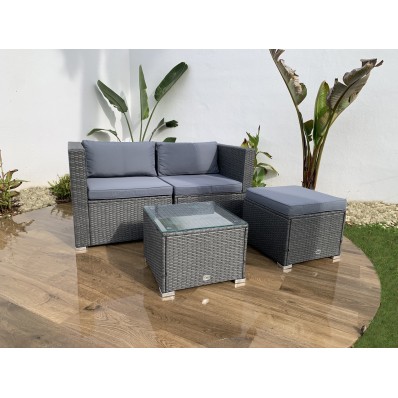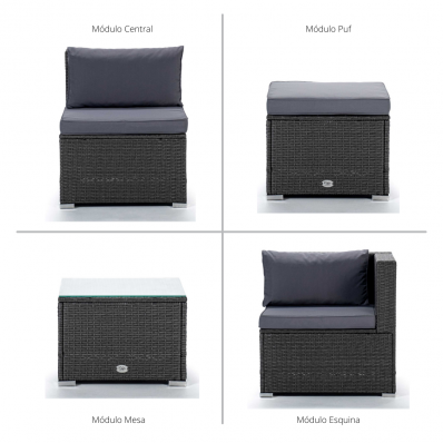 El modelo Bahamas conjunto doble es un moderno conjunto modular de muebles de exterior perfecto para tu balcón, jardín o terraza, compuesto por 1 sofá doble, 1 mesa de centro y 1 puf o cubo otomano, por lo que está diseñado para alojar a 3 personas.