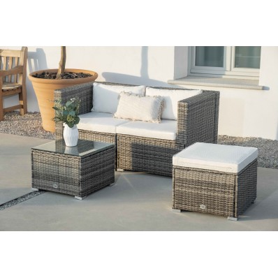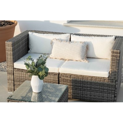 El modelo Bahamas conjunto doble es un moderno conjunto modular de muebles de exterior perfecto para tu balcón, jardín o terraza, compuesto por 1 sofá doble, 1 mesa de centro y 1 puf o cubo otomano, por lo que está diseñado para alojar a 3 personas.