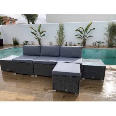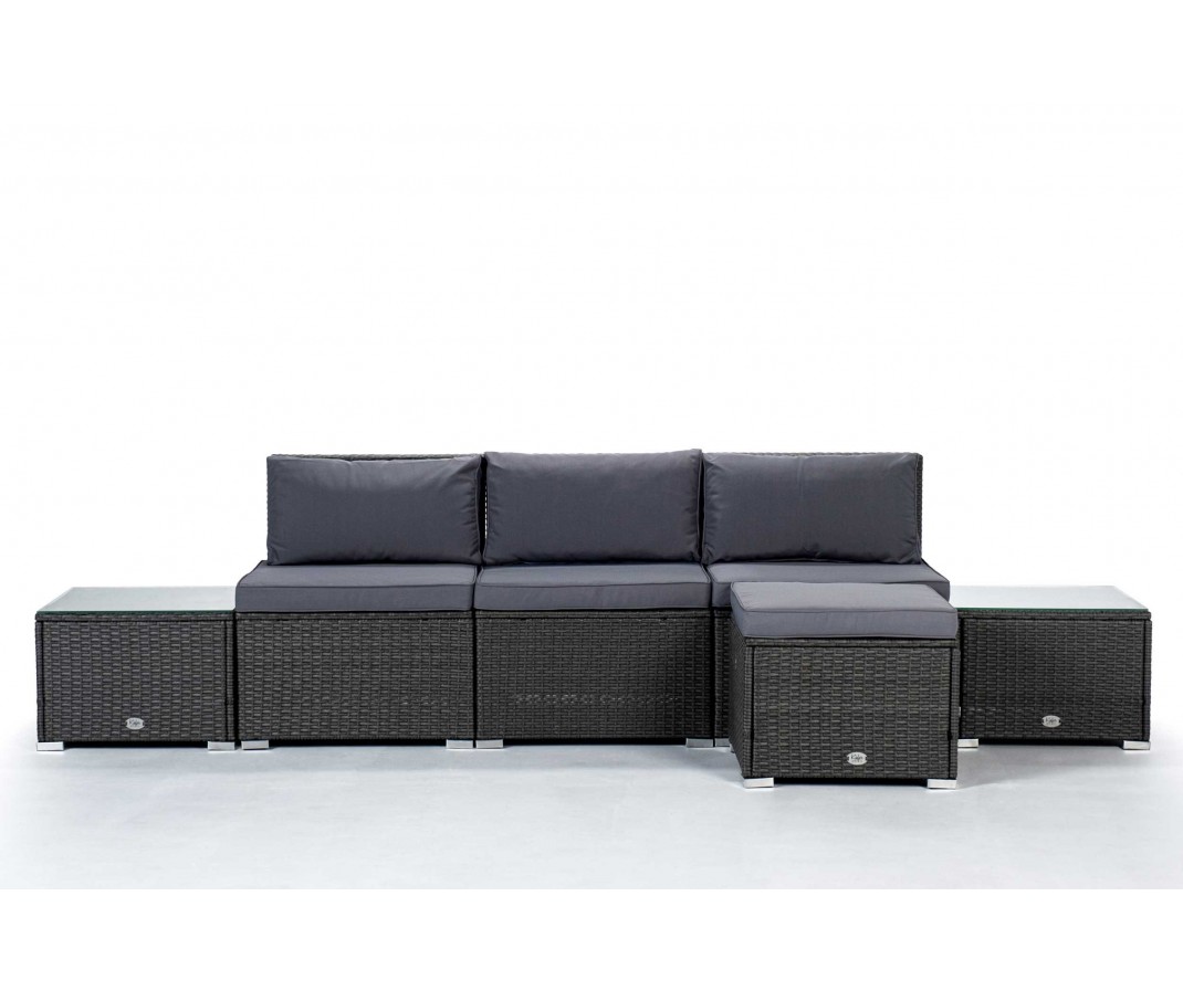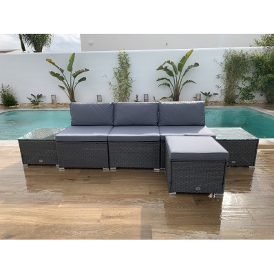 El modelo Bahamas conjunto central doble mesa es un moderno conjunto modular compuesto por 1 sofá triple, 2 mesas de centro y 1 puf o cubo otomano, por lo que está diseñado para alojar a 4 personas.