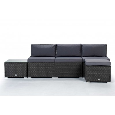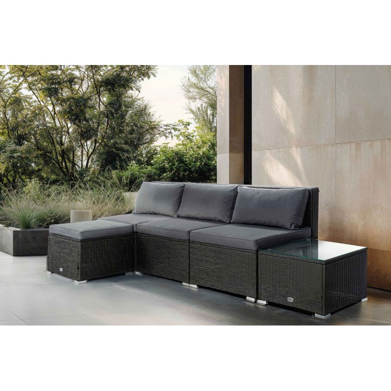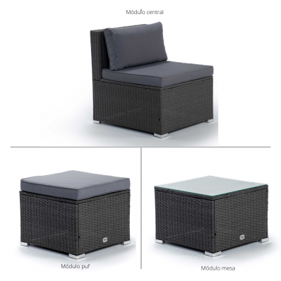 El modelo Bahamas conjunto central es un moderno conjunto modular de muebles de exterior perfecto para tu balcón, jardín o terraza, compuesto por 1 sofá triple, 1 mesa de centro y 1 puf o cubo otomano, por lo que está diseñado para alojar a 4 personas.