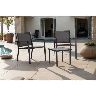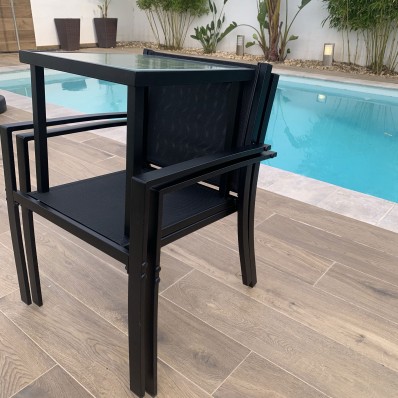 La estructura del mueble de exterior es de acero inoxidable en color negro y el asiento está compuesto por textileno en color negro el cual da una alta durabilidad y resistencia a las inclemencias meteorológicas