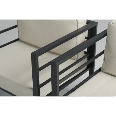 Sus cojines de alta calidad que tienen un grosor aproximado de ±12 cm para los cojines del asiento y ±16 cm para los cojines de respaldo. Son cojines rellenos de espuma de poliuretano de alta densidad con fundas 100% de poliéster que repelen los líquidos. El tejido de estos cojines pertenece a la gama premium textil Kiefer 2025, siendo sus acabados de alta calidad, sin posibilidad de decoración por parte de la exposición solar.