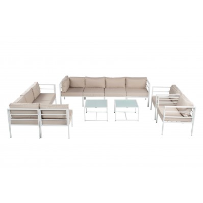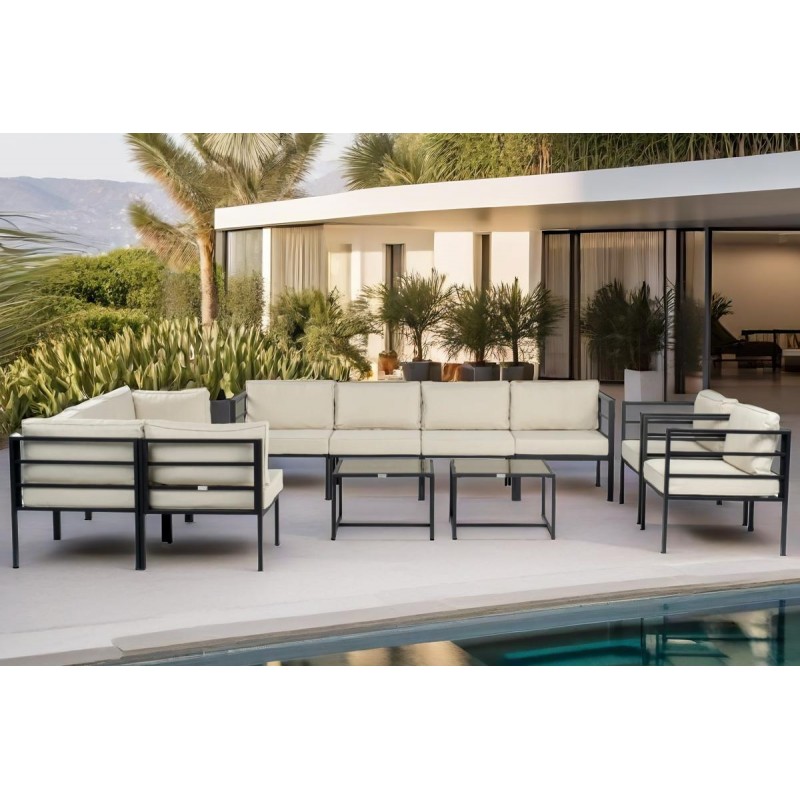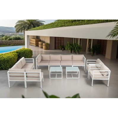 El modelo Madrid Deluxe es un precioso set de muebles de exterior de calidad premium ideal para pasar momentos al aire libre en buena compañía. Se trata de un moderno conjunto de muebles de exterior perfecto para tu balcón, jardín o terraza, compuesto por 2 sofá modular formado por 4 módulos centrales y 4 módulos esquina, 2 sillón individual y 2 mesa baja de centro, por lo que está diseñado para alojar a 10 personas.