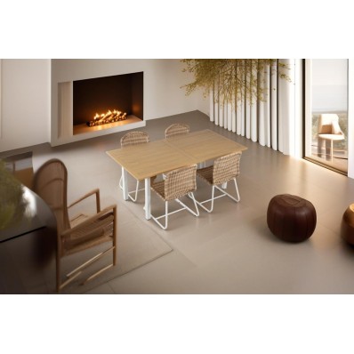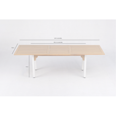 La mesa extensible está fabricada en acero blanco y madera, con refuerzo en las esquinas de las patas para darle estabilidad y resistencia. La longitud de la mesa es de 180cm, llegando a 240cm si se extiende.