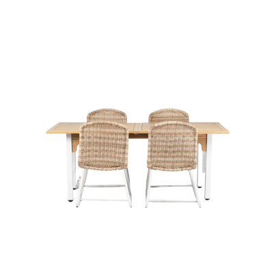El modelo Sevilla 4 es un moderno comedor de exterior perfecto para tu balcón, jardín o terraza, compuesto por 4 sillas individuales y 1 mesa alta extensible de comedor, por lo que está diseñado para alojar a 4 personas.